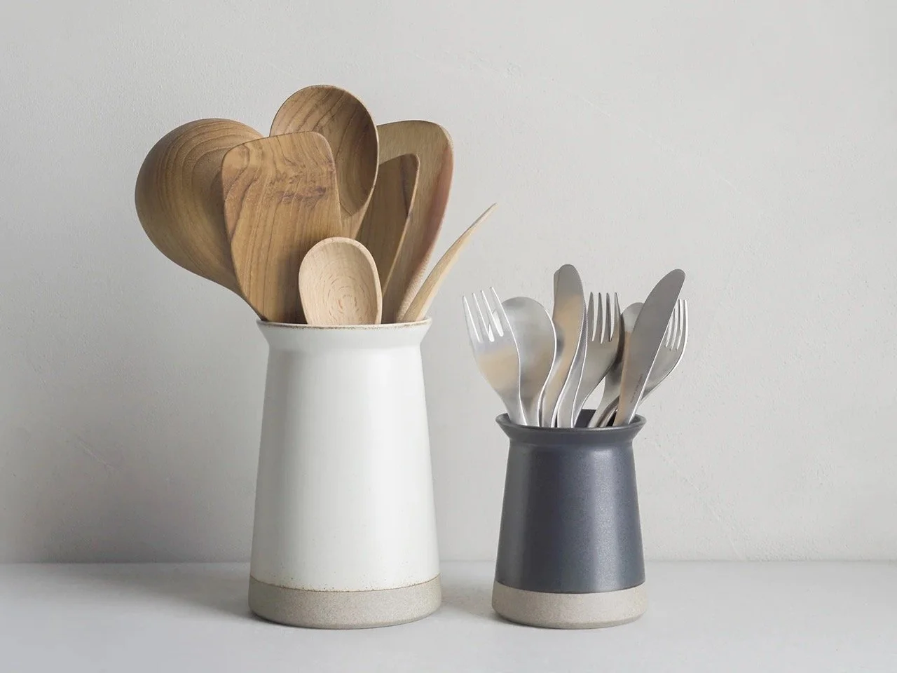 La large bouche permet d'accéder facilement aux ustensiles, tandis que le col étroit empêche les ustensiles plus longs de s'écarter.